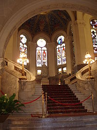 The piano is above the red carpet that is our lobby area and front desk. See the people coming up the stairs into our "main" room?